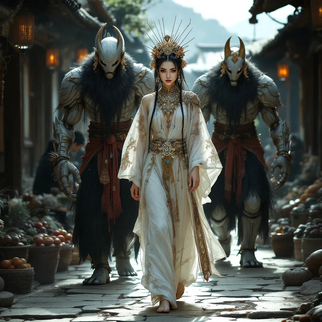 An ethereal beauty walk on a village market walks next to two huge bodyguard golem (full body view9, Barefoot, full body view, focus on feet draped in ancient elegance, her gaze both fierce and enigmatic, as if guarding secrets lost to time. A striking, avant-garde anime-style portrait of a beautiful woman in ceremonial, ancient folk attire, blending high-fashion editorial aesthetics with a dark fantasy essence. Her outfit, inspired by traditional and mystical designs, is adorned with vintage jewels and intricate headpieces that evoke a timeless power and ethereal allure. the villagers step aside to let them pass and bow to the woman