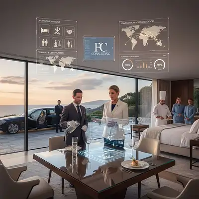 A sophisticated, elegant, and confident woman in her thirties, wearing a minimalist white and navy outfit (PC Consulting's colors) . She stands in a modern luxury villa with panoramic windows overlooking the French Riviera. In her hand, she holds a sleek digital tablet adorned with glowing AI icons, a symbol of innovation and concierge service. Ambiance: Upscale, calm, and professional, with soft natural light. Style: High-end editorial photography, luxury brand aesthetic, clean, and modern composition. Creates multiple images of her in different positions and different villas, luxury chalets