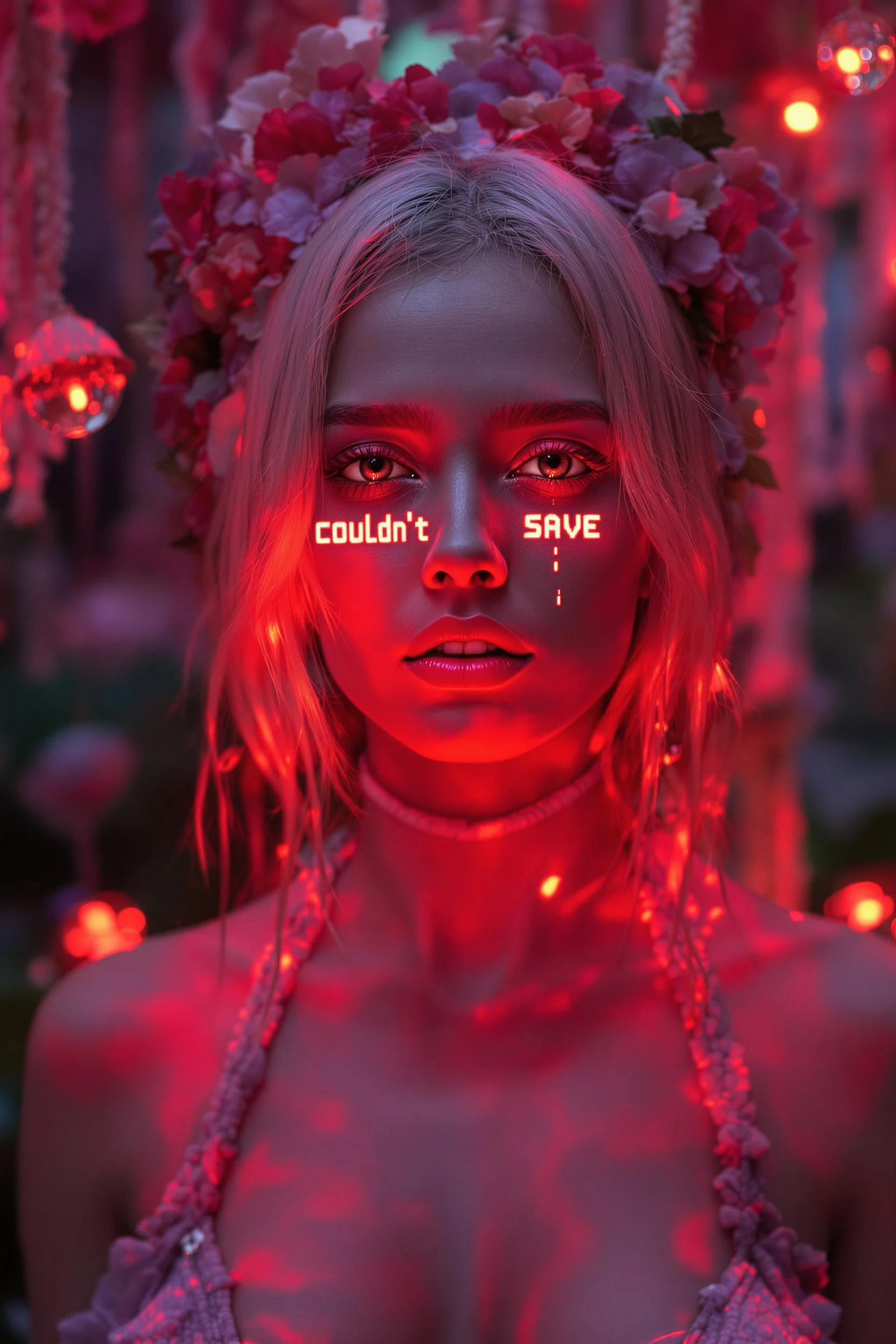 Ultra sharp photography of a centre focused Blonde nymph cyborg with a pixelated teardrop on her face, looking in the camera, on her face and body it writes "Couldn't Save" as if projected with a red projection light, a pixelated teardrop falling from her eyes, part of her face is pixelated and glitched, botanical abstraction, in a magical and bioluminiscent jungle, retrowave arcade, backrooms aesthetic, liminal vibes, dreamcore, in the style of Sheidlina + Frida Kahlo, botanical abstraction, fuzzy plants like hair growing in the park, unusual flora, candy flowers, sharp focus on the nymph, volumetric light, photorealistic, photography, well - balanced composition + perfectionism + the image is shot with a Canon EF 16-35mm f/2. 8L III USM lens on a Canon EOS 5D Mark IV camera, hyperdetailed corona render.