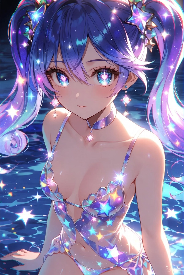 anime art of Mitsuri Kanroji, covered nipples, chromatic aberration, glow, perfect face, curvy body, masterpiece, goddess, Star covered water background, glow, god rays, ethereal, dreamy, heavenly, otherworldly, dream-like, breathtaking, captivating, divine, heart shaped pupil eyes, camel toe. lingerie, creampie, after sex, world-class masterpiece, 4k, best quality, anime art.