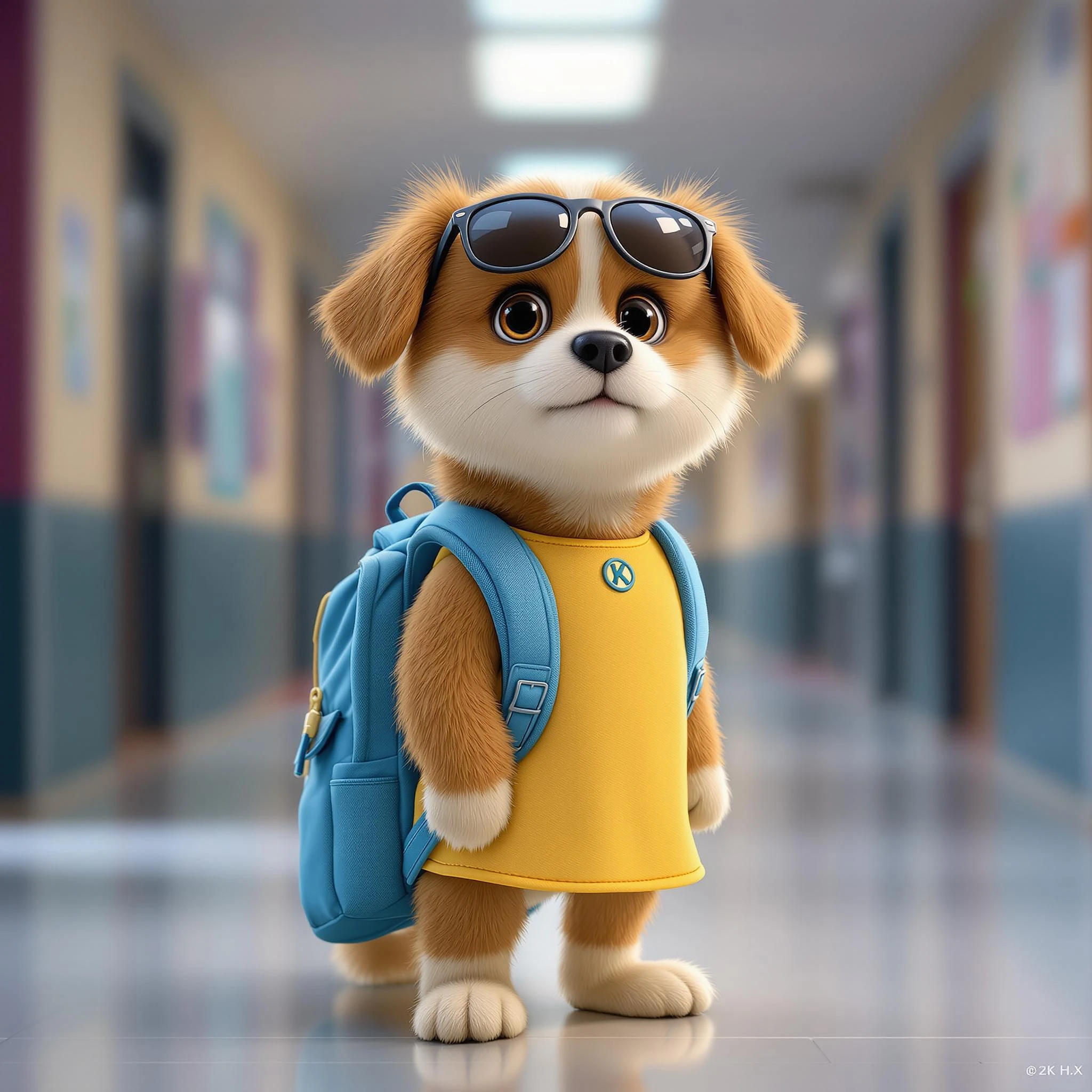 A cute dog standing like a person, dressed in a yellow dress, a blue backpack and a sunglasses on her head, ready to go to school, full body, the background is a school hall, in a realistic and fantastical style, meticulous design, high quality, lifelike figures, precise and lifelike, strong facial expression, 32k uhd, photorealistic.