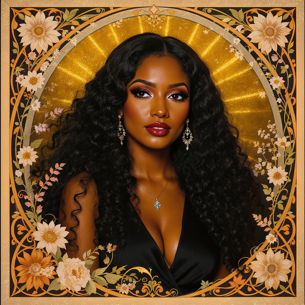 a beautiful woman in a black dress posing for a photo, an album cover, inspired by Thomas Blackshear, arabesque, with brown edge, full of flowers, ( brunette skin ) , complete shot of the product