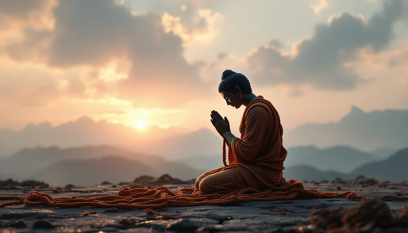 Photo of a ultra realistic, dramatic light, pale sunrise, cinematic lighting, battered, low angle, 4k, hyper realistic, focused, extreme details, unreal engine 5, cinematic, masterpiece, Buddha praying to the the Devine on his knees wearing an orange rope and the image is to be realistic and magical