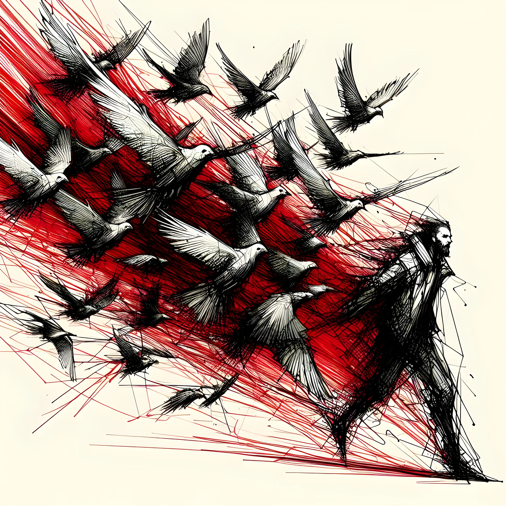 an in black and red sketch of a Flock in the style of magewave, comic book dynamism, focus on joints/connections, joram roukes, farel dalrymple, radiant clusters, rough sketch, blurry effect.