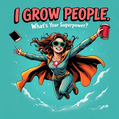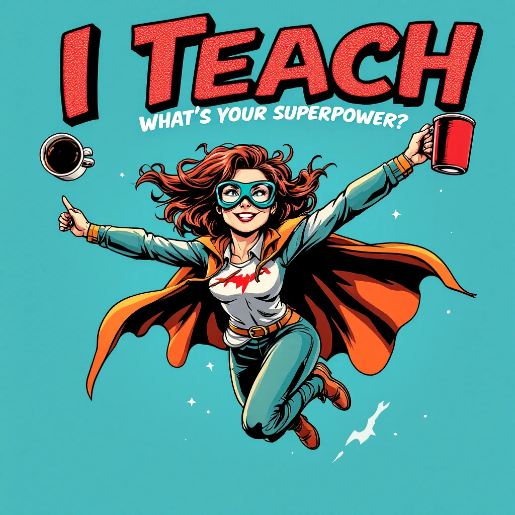 A dynamic, comic-style superhero teacher flying with books in one hand and a coffee mug in the other. The text says: ‘I Teach. What’s Your Superpower? ’ in bold, action-movie style letters. "