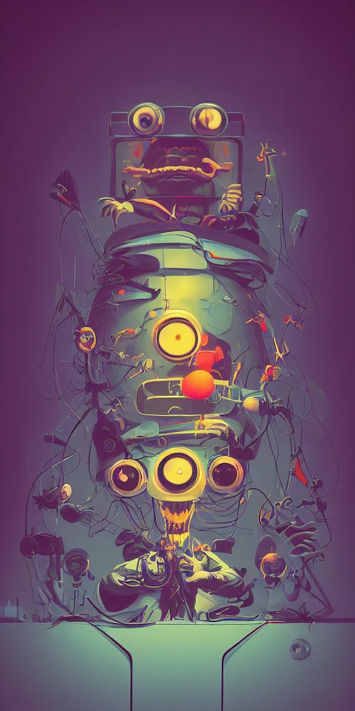 techno occult ART, funky band, retro-abstract art, low brow, avant-garde, by Goro Fujita, chris mars, simon birch, diego rivera, and r. crumb, style dreamworks and PIXAR, trending on Behance, crazy, intense, intricate, HQ concept art, hyper-detailed, octane render, a masterpiece