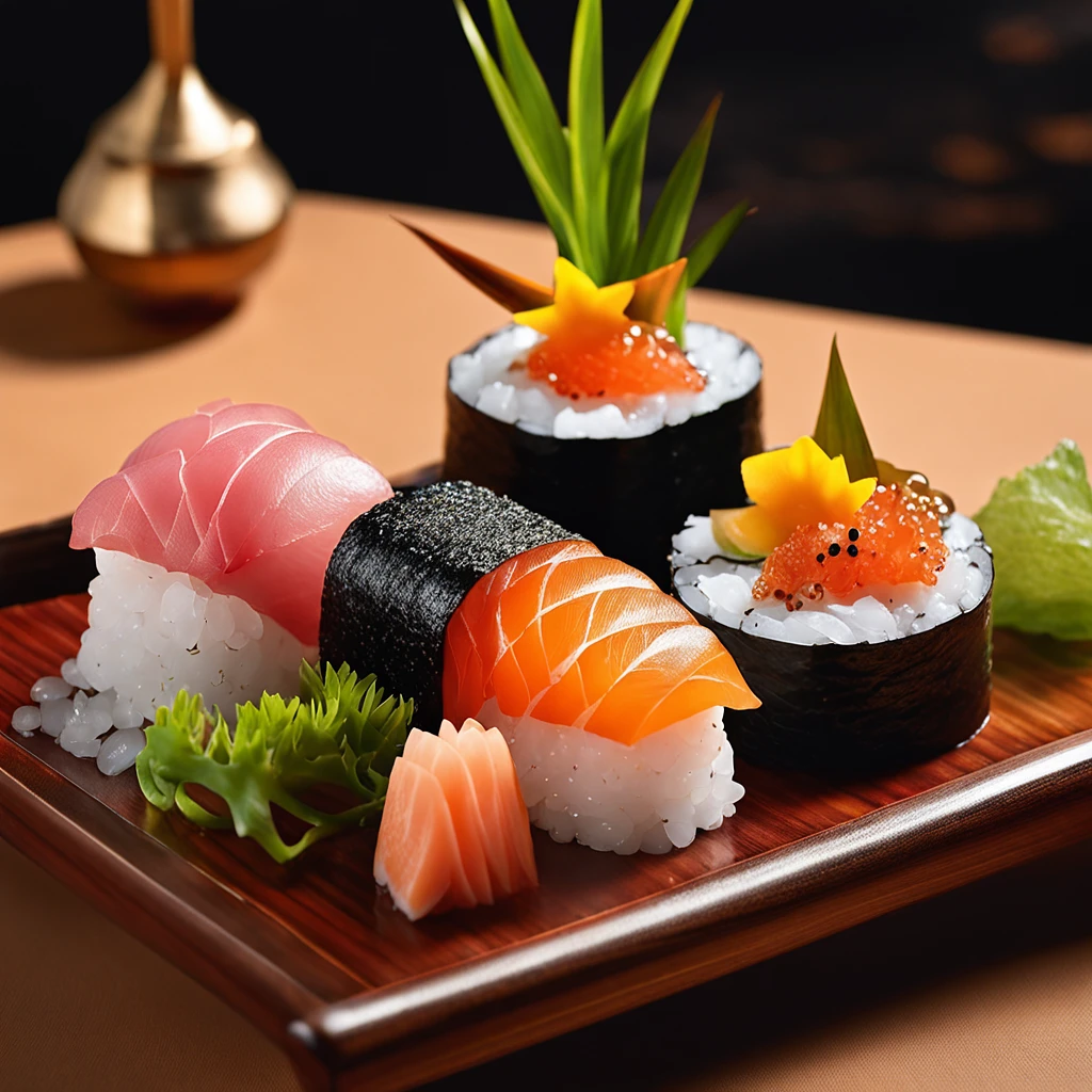 Capture a close-up shot of a mouth-watering beautifully arranged sushi and sashimi, honey & soy, exuding tempting allure, at 3 Stars MICHELIN restaurant. This gourmet scene showcases clean composition, dramatic soft lighting, and luxurious elegance. The centered composition emphasizes the indulgent appeal. The evening setting, under the expertise of a food stylist, brings out the irresistible beauty of the high-end culinary creation. (StableDifusionXL1. 0 - SeargeSDXL)