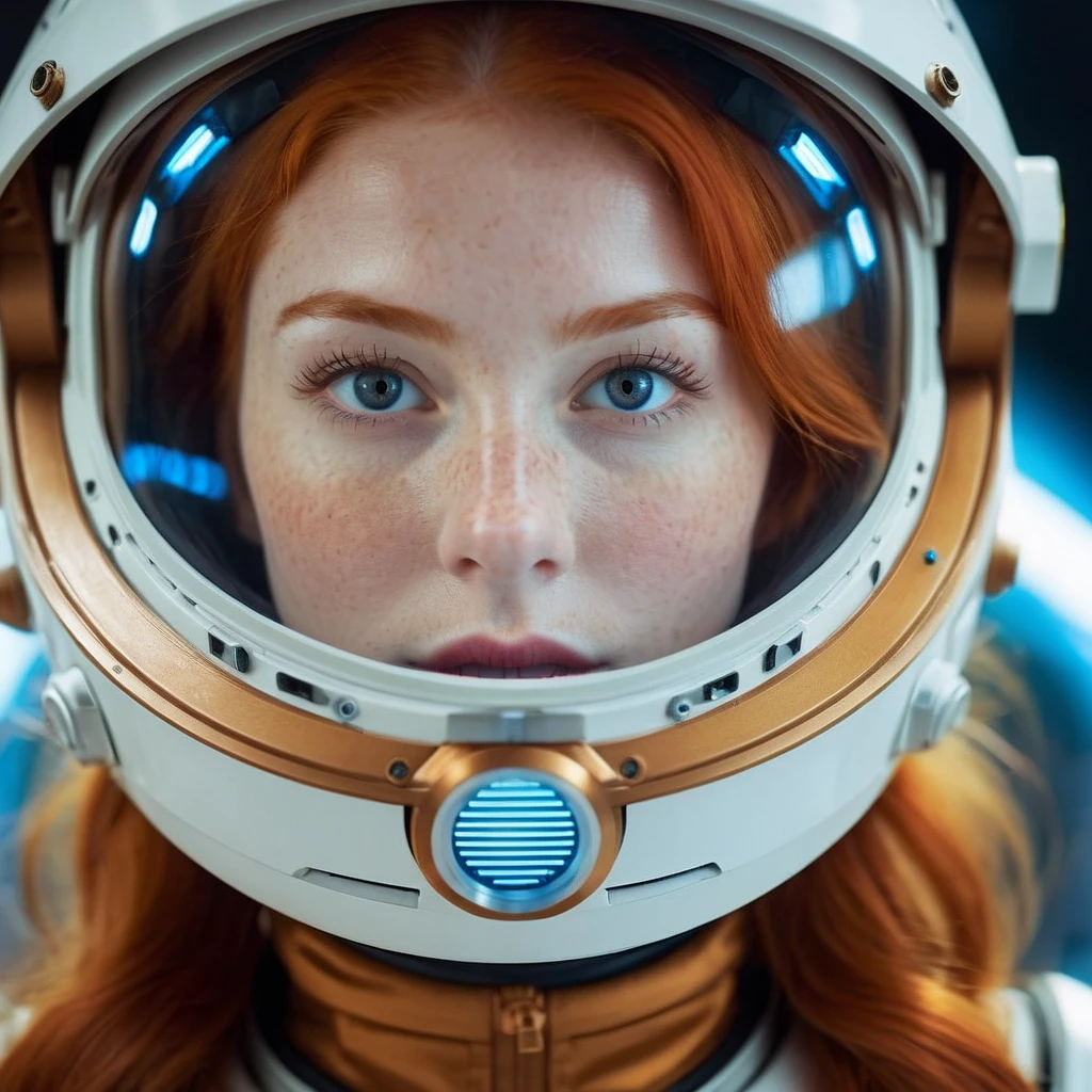 Photo of a ginger woman, in space, futuristic space suit, (freckles:0.8) cute face, sci-fi, dystopian, detailed eyes, blue eyes