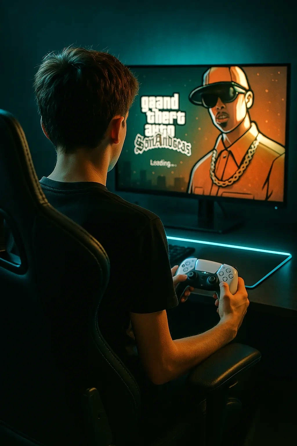 hyper-realistic depiction of a boy clad in black shirt, senn from behind, sitting on a a gaming chair with the ps5 controller in his hands, in the monitor ahead plays the loading screen of GTA San Andreas, the room is dark with minimal cyan neon lighting, ultra-realistic, hyper-detailed, breathtaking clarity and ultra-sharp details. Enhanced textures, refine edges, and eliminate noise while preserving the natural beauty of every element. Boost depth, vibrance, and realism without artificial artifacts. Maintain a cinematic balance of lighting and contrast, ensuring a visually stunning masterpiece with mesmerizing sharpness and impeccable detail. Hyper-realistic detailing, sharp textures, ultra-hd, detailed textures, ultra-high resolution, deep-contrasted, high-saturation, deep-gradient colour, glowing effects, hyper-realistic particles, ethereal and surreal visual, deep vfx, sharply focused, 16k resolution, ultra-realistic cgi, clarity