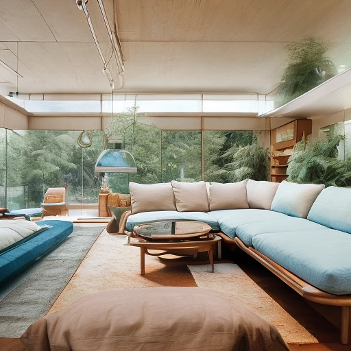 high resolution photography interior design, dreamy sunken living room conversation pit, wooden floor, small windows opening onto the garden, bauhaus furniture and decoration, high ceiling, beige blue salmon pastel palette, interior design magazine, cozy atmosphere
