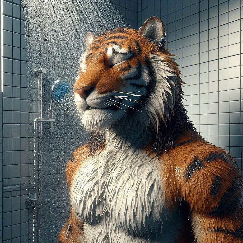 3D animation of a long-furred tiger man standing under a shower of water in a room with a tile floor and tile walls, his face relaxed and his eyes closed as a distant hum echoes around him.