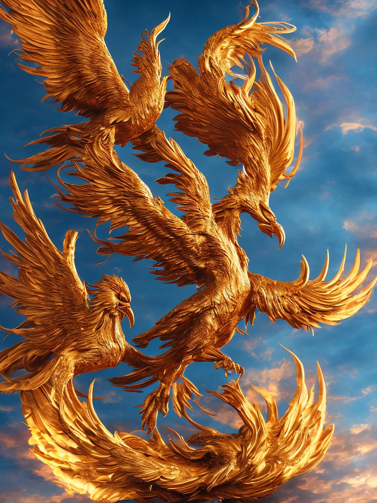 A majestic phoenix with vibrant plumage, its fiery wings spread wide, golden feathers illuminating against a dark sky, perched atop a rugged mountain peak, surrounded by swirling clouds, capturing the phoenix's grace and intensity, Sculpture, bronze casting, 8k high definition --ar 1:1 --v 5