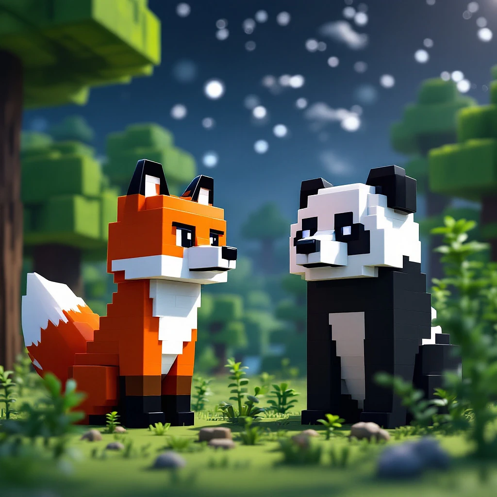 a minecraft world with all minecraft animals, fox and panda, minecraft trees, nightsky in the background, minecraft lego style