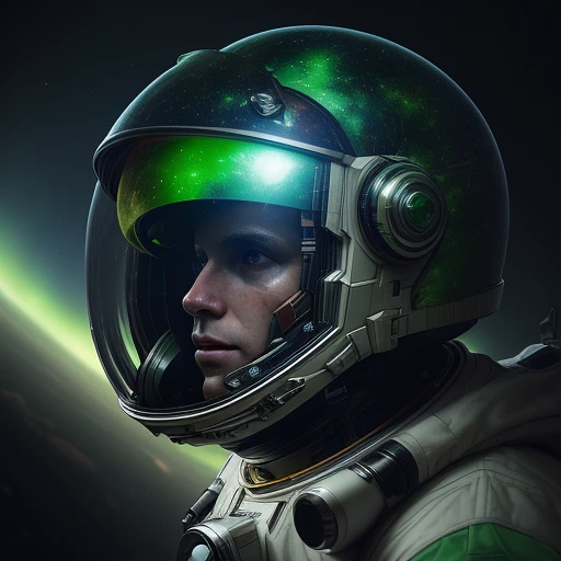 Growing green in a broken helmet of an astronaut in open space, galaxy, nebula, photorealistic, 8k octane render, hyper detailed, volumetric lighting, hdr. --ar 9:16