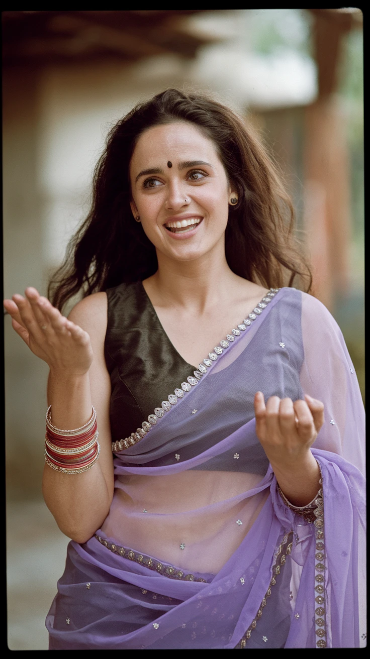Jennifer Connelly , 18-21 years old, Indian hair style, trying to love, inhaled chest, wide open eyes, A plus curvy shaped body structure, showing bangles on hand, bindi, high-quality photo portrait, shot on a Kodak camera, photography, environmental, double eyelid --ar 34:65 --style raw, indian ascent, flying kiss, feeling happy, beautiful legs, wearing violet transparent sari with black silk blouse.