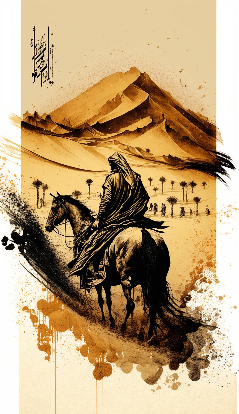 A mixed media artwork depicting the journey of Imam Hussain to Karbala, by Amirhossein Khademi, incorporating traditional calligraphy, collage, and digital elements, using a warm and earthy color palette, evocative of the desert landscape, with strong textures and bold shapes, a tribute to the resilience and endurance of Imam Hussain and his followers, hyper realistic, detail 8k --ar 9:16