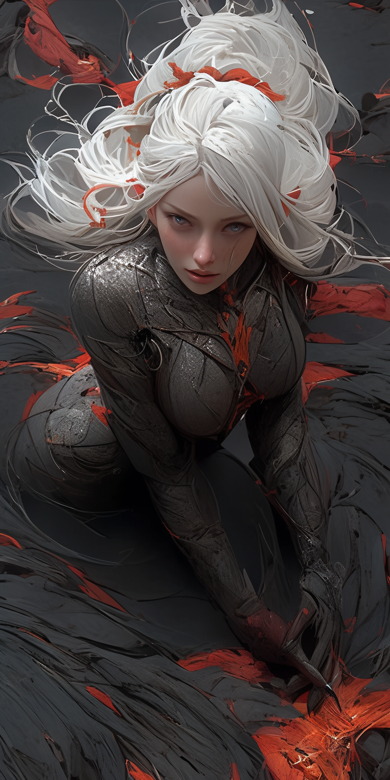 top view photography of gorgeous metawoman, white hair and red eyes, emerging from lava in shimmering fiery pool on island, intricate details, in the style of Feng Zhu, capturing the essence of this iconic character, hyper realistic and hyper detailed, stunning composition, hyper emotional, epic cinematic lighting, 32k UHD resolution, shot on Hasselblad H6D