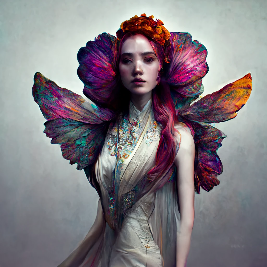 beautiful realistic proportions young woman colorful hair, goddess of flowers with wings, bejeweled wearing haute couture, elegant, illustration, character concept art, fantasy, elvish, maximalist, Charlie Bowater, WLOP, Laura Rubin, cinematic color grading, hyperrealism, fashion editorial photoraphy, nick knight photography