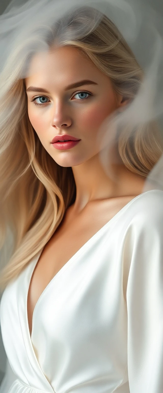 "Fine art photograph. full body image. A blonde supermodel woman in her early twenties, Refined facial features, graceful and elegant, amidst swirling mist. Crisp white silk dress Soft pastel colours, medium visibility. Modernist aesthetic, soft contrast, gentle and soothing. Professional photography. "