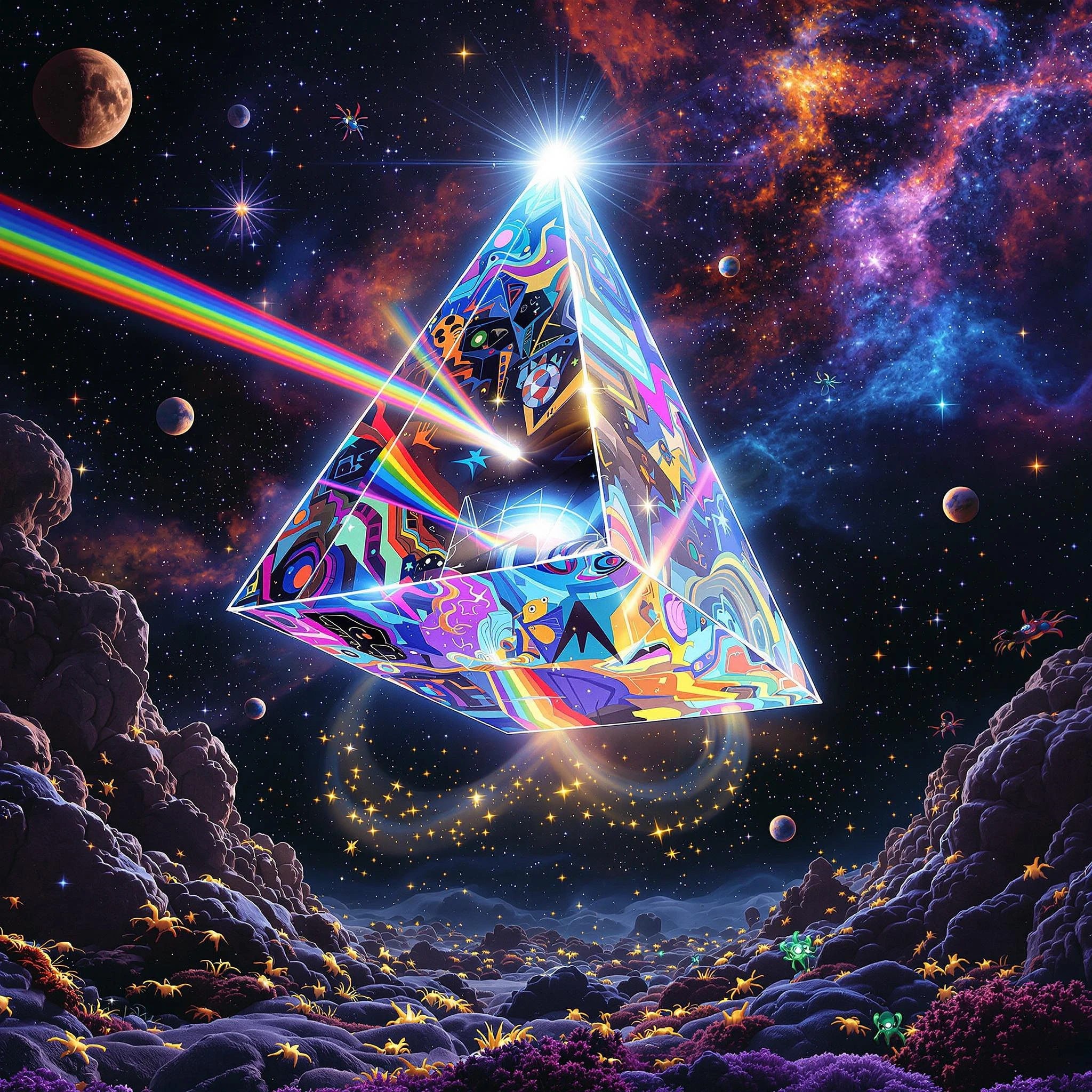 Trippy, psychedelic, and surreal, A giant, clear three-sided prism floating in outer space with white light entering it on one side and emerging on the other sides in multiple colors. Like on Pink Floyd's album cover. The space void is filled with numerous stars, bioluminescent creatures, and intricate artwork. The scene is rendered in octane, featuring, cinematic quality, high detail, and 8k resolution.