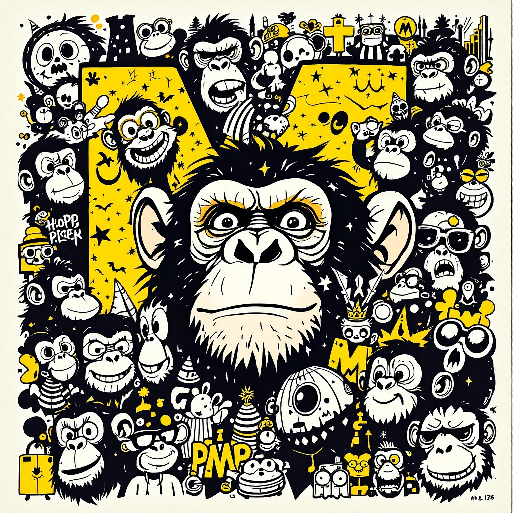 An intricate and mainly black and white, and yellow, (two contrasting, extra colors for details) , graffiti-style poster featuring various elements, such as cartoon characters, symbols of urban culture, and dynamic expressions, focusing on minimalistic chimp faces, the letter 'M' is part of the image --ar 63:128 --stylize 750