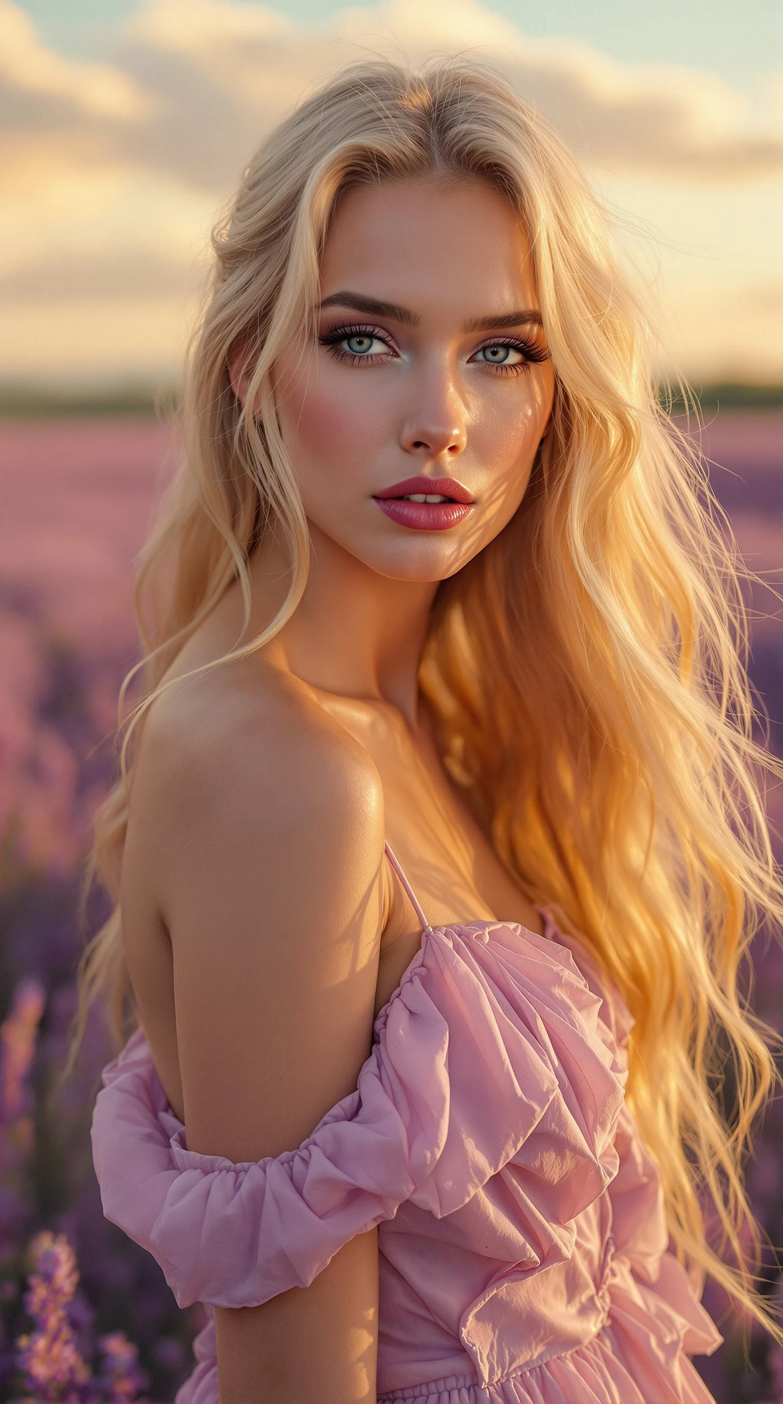 "Fine art full hight, body image photograph, warm golden hour light, soft pastel colours, dramatic cinematic style, supermodel with fair skin and long flowing golden blonde hair in a lavender gown, standing gracefully in a symmetrical lavender field, sunset sky, soft clouds, visually striking composition. "