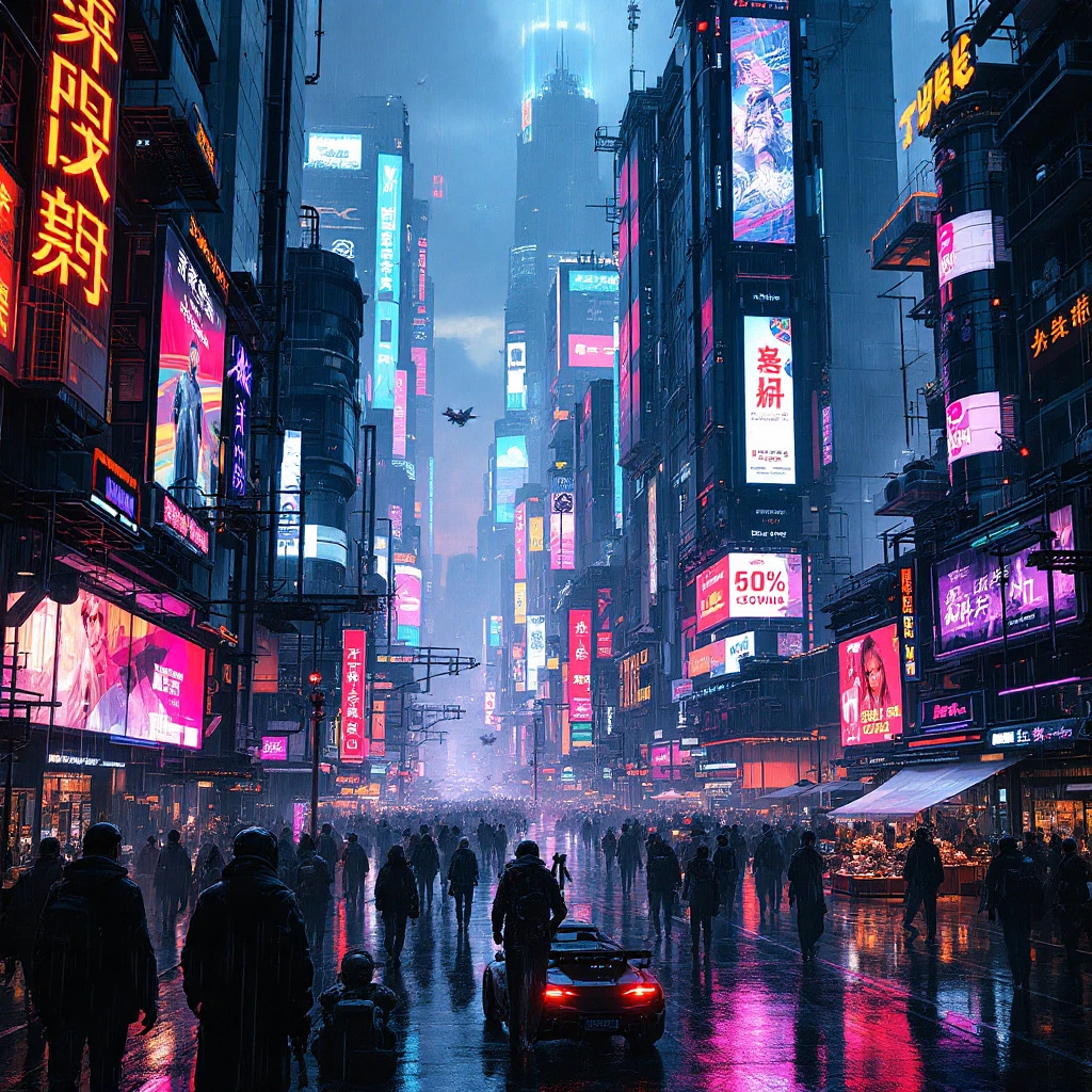 Imagine stepping into a cyberpunk world, drenched in neon lights and bathed in the glow of technology's dominance. The scene unfolds in a sprawling, futuristic city, towering skyscrapers that stretch far beyond the clouds, their sleek metal and glass surfaces reflecting the pulsating lights of the urban landscape. The buildings are adorned with giant holographic billboards, advertising everything from corporate products to virtual experiences, all flickering with vibrant hues of electric blue, hot pink, and acid green, creating an ever-changing kaleidoscope of light. The streets below are a maze of dark alleyways and crowded, bustling thoroughfares, slick with rain that reflects the bright neon signs like a pool of liquid light. There’s a constant hum of machinery, the distant roar of flying vehicles zooming overhead, leaving glowing trails of exhaust behind them. The air is thick with the smell of metal, synthetic fuels, and the distant aroma of street food. The sounds of the city are an industrial symphony: the rhythmic clanging of robotic workers, the screeching of anti-grav vehicles, and the murmur of countless voices speaking in various languages. The crowd in the streets is a diverse blend of humans, augmented humans, and artificial beings. People walk with cybernetic limbs, their skin etched with glowing tattoos that pulse with an eerie rhythm, and their eyes replaced with high-tech implants that flash with data. A group of individuals huddles near a glowing street corner, one person’s face hidden by a sleek, metallic mask, while another’s hair seems to shimmer with digital static, reflecting the neon lights. Above the crowd, neon-lit signs flicker in languages unknown, advertising everything from virtual reality escapes to shady black-market tech. The walls around you are adorned with posters, both official and rebellious—corporate logos clashing with graffiti-style tags, political slogans, and cryptic symbols that pulse in sync with the city’s heartbeat. The ground is covered in a thin sheen of rainwater, reflecting the vibrant lights from above. Scattered puddles mirror the blinding colors of advertisements, creating fractured images of the city in the liquid below. The pavement is uneven, cracked in places, with patches of discarded tech and scraps of machinery lying forgotten in the corners of alleyways. Neon lights hum overhead, casting long shadows across the pavement as figures pass by in dark clothing, their faces hidden beneath hoods or visors, blending into the night. To one side, a large, towering building with a sleek, metallic facade looms over the city, its top disappearing into the cloud cover, and the lower levels of the structure are illuminated by endless rows of windows, each glowing with a different hue. The air feels heavy with the weight of corporate control and technology’s encroaching presence in every corner of life. The sky above is a deep, unnatural shade of purple, thick with the haze of pollution and the glow of distant satellites and drones that buzz by, monitoring the city below. In the distance, colossal floating structures or spaceports are visible, sending off ships and transports into the stars, their exhaust trails streaking the sky like lines of light against the dark backdrop. The overall aesthetic is one of stark contrasts: the warmth of the neon against the cold, metallic environment; the technological advancements that seem to enhance the human form, yet simultaneously dehumanize it; and the feeling of chaos and control, all wrapped in a palpable atmosphere of dystopia. The cyberpunk scene is both intoxicating and oppressive—an intricate world where the future is not just advanced, but corrupted by corporate greed, urban decay, and a constant battle for control, both personal and societal.