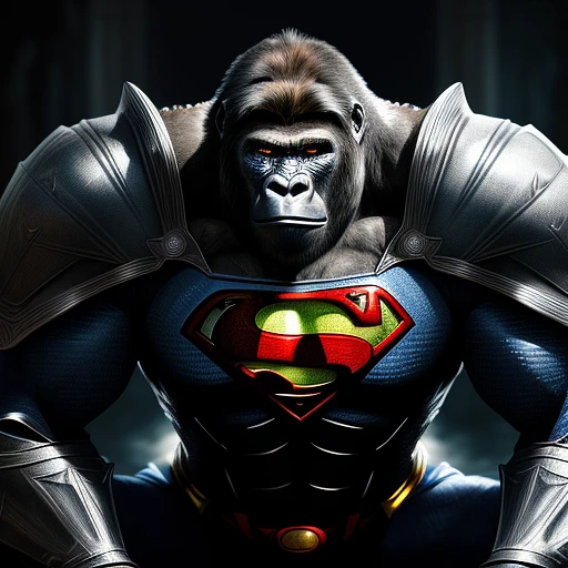 kneeling Superman gorilla knight, portrait, finely detailed armor, intricate design, silver, silk, cinematic lighting, dramatic lighting, 4k