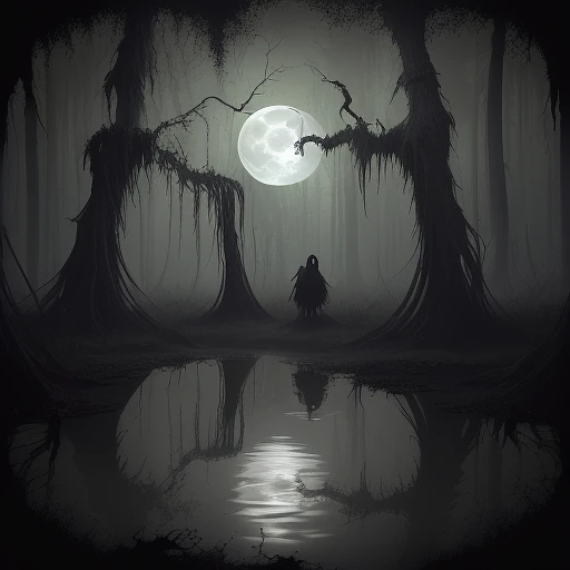 greasy dreads, winking, waste deep in a swamp, dark forest of dead trees protruding from a bubbling swamp, a full moon with the silhouettes black ravens in the moonlight, epic journeys, dark fantasy, in the style of venetian rococo, multiple filter effect, dark white and light gold, hyper-realistic water, Phoenician art