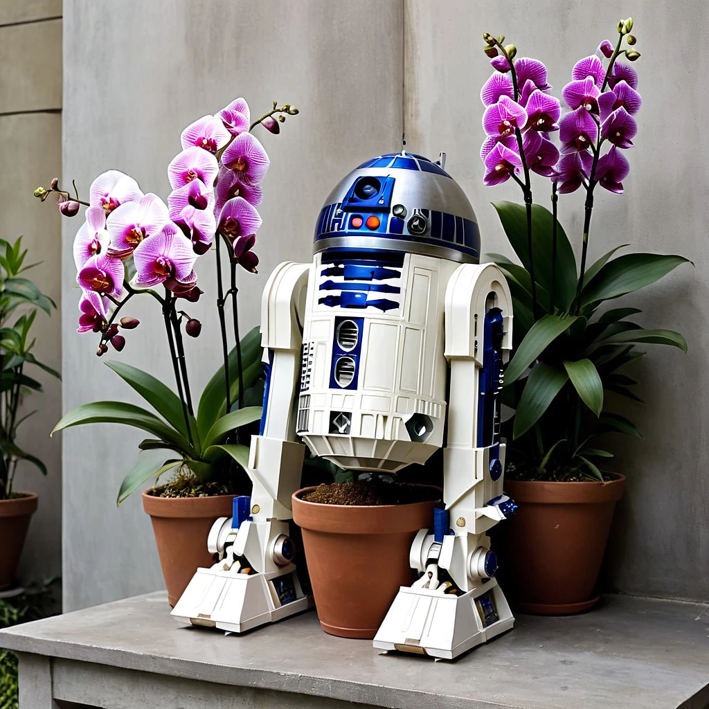 (((R2d2) )) flower pot holding orchids, outdoors scene, (hyper-realistic:1. 2) , highly detailed, rule of thirds, cinematic, absurdres, masterpiece, painting in the style of studio ghibli, (Masterpiece:1.3) , (best quality:1.3) , <lora:add_detail:0.4> <lora:epi_noiseoffset2:0.4> <lora:hairdetailer:0.6> <lora:more_details:0.3> <lora:add-detail-xl:1.2> <lora:DetailedEyes_V3:1.2> <lora:sd_xl_offset_example-lora_1.0:1.2> , (natural skin texture, hyperrealism, soft light, muted colors) , background