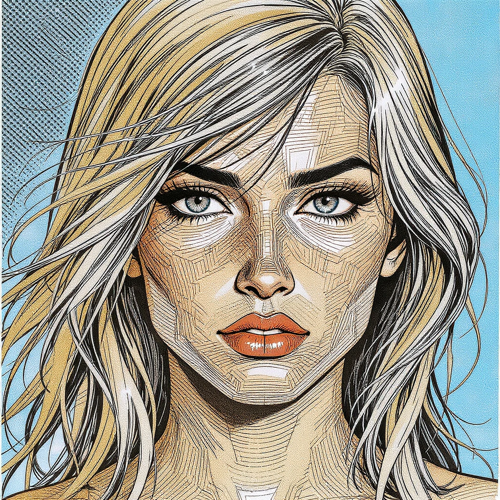 the face of a young woman, in the style of detailed comic book art, layered lines, light bronze and sky-blue, leica i, densely patterned imagery, realistic human figures, graphic print-based --ar 63:128 --stylize 750 --v 6