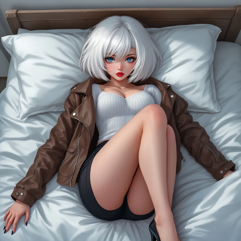 anime, woman, white hair, bob cut, blue eyes, freckles, red lips, white sweater, tight sweater, short leather jacket, brown leather jacket, black tight skirt, short skirt, bare legs, black high heels, bored expression, big chest, lying down in bed