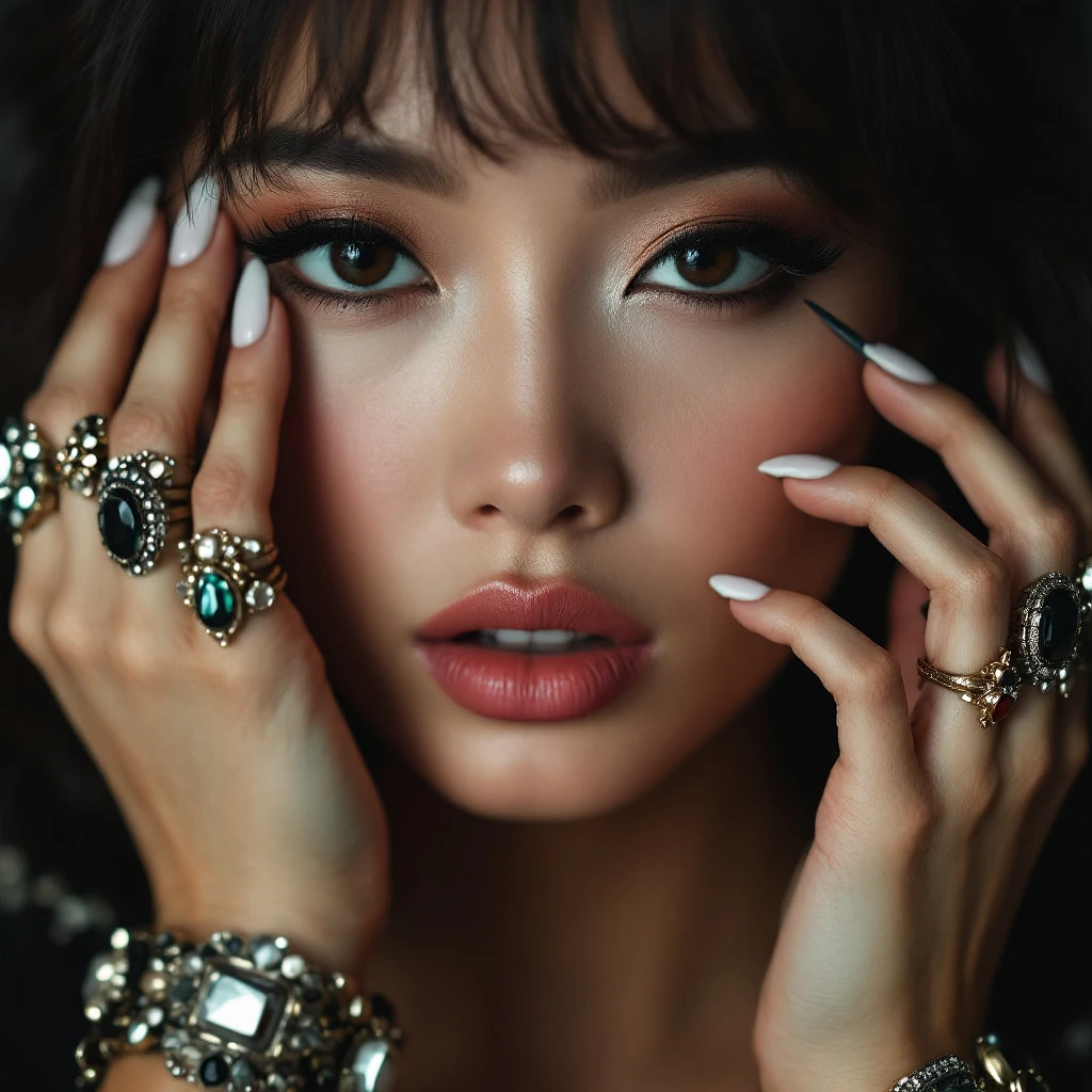 A color close-up image. A person, likely a woman of Asian descent, is in the mid-20s to early 30s. She is positioned from the mid-chest up, and filling in black eyeliner on her right eye. Her expression is neutral and somewhat serious, reflecting concentration. She has a medium build and is wearing numerous chunky, ornate rings and bracelets on her hands and wrists. The style of the rings and bracelets is elaborate and bold, with a mix of metallic and gem-like elements. The nails are painted white. The focus is on the process of applying eyeliner, highlighting the precision and detail involved. The lighting is directed, creating strong contrasts between the highlights and shadows, and casting emphasis on the hands, face, and rings. The perspective is directly in front, almost as if looking into a mirror. The composition is centered on the subject's face and hand. The overall atmosphere is dramatic and stylish, with a focus on makeup artistry. The image is detailed and precise.