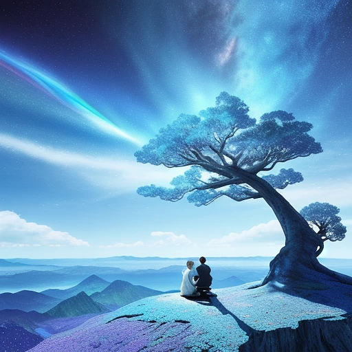 Boy and girl looking at the horizon sitting on the epic tree in the background. Beautiful prismatic-plasma lake blue crystal, mounteins epic, digital painting, extreme detail, 4k, ultra hd, hyper detailed, colorful, sparkle covered sky, masterpiece 3D science fiction art. Bright blue skys, clouds brigth white. sun white brigth. day. Sun.