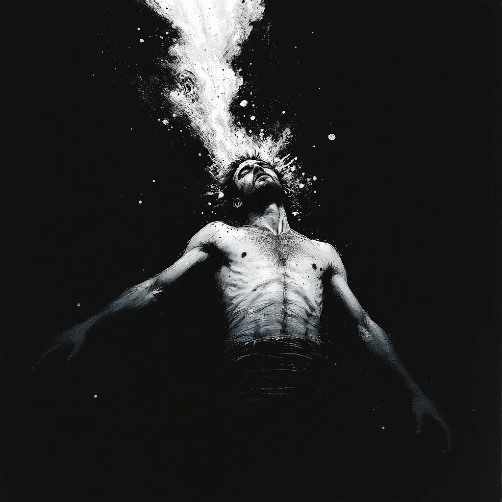 illustration of a drowning man, under the sea, alone, struggling to breathe by Jeremy Mann, Hugo Pratt, Milo Manara, Enki Bilal, Jean Baptiste Monge, wet ink, charcoal sketch