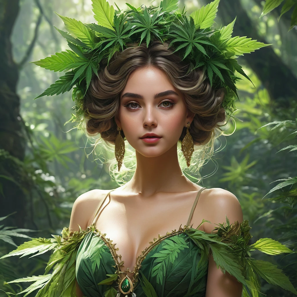 arafed woman with green leaves on her head and a dress, personification of marijuana, princess of cannabis, portrait of a dryad, 8k high quality detailed art, 4k highly detailed digital art, goddess of the forest, artwork in the style of guweiz, beautiful digital artwork, fantasy art style, detailed digital anime art, guweiz masterpiece