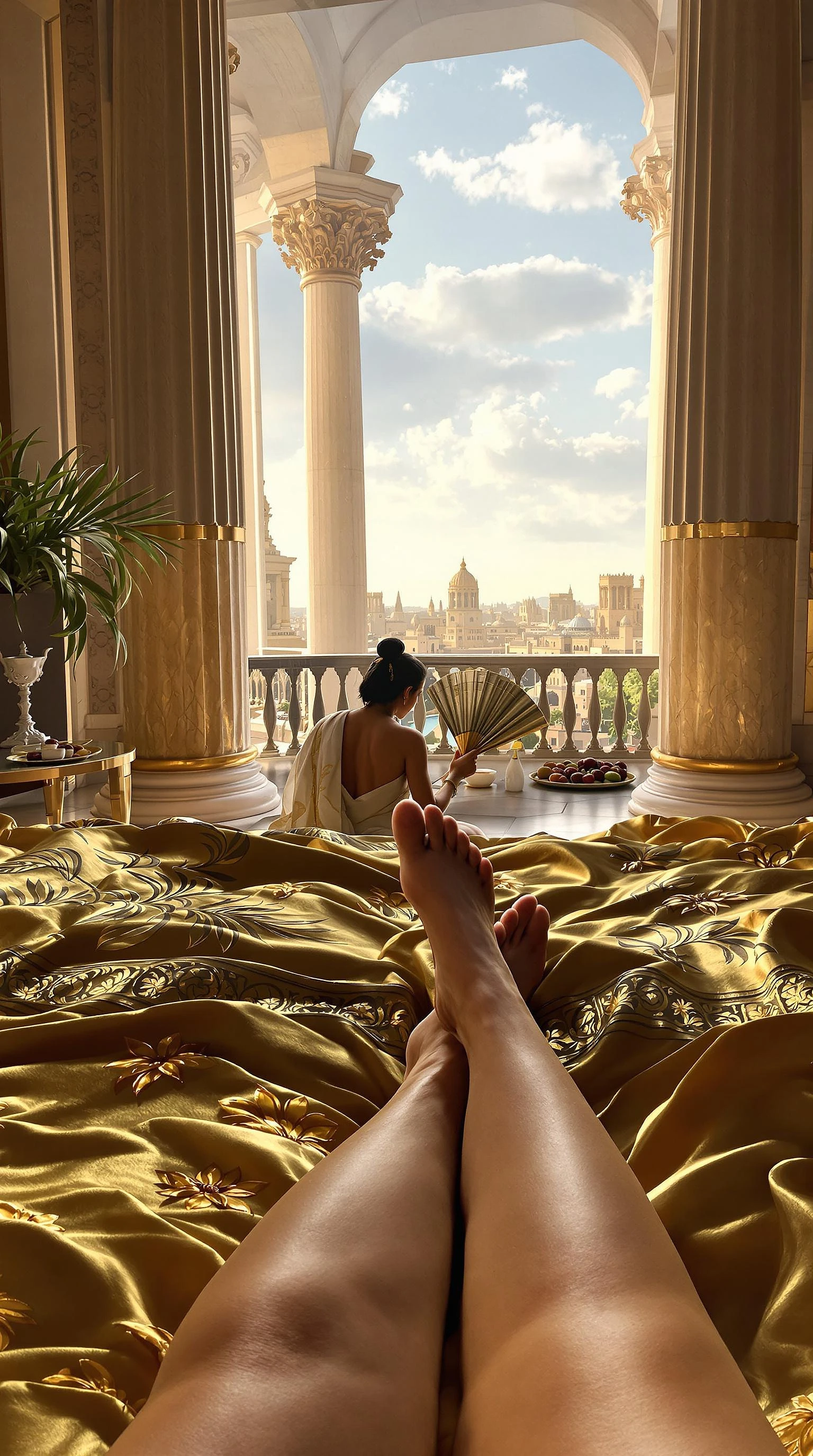 A hyper-realistic first-person perspective of Cleopatra VII waking up in her royal chamber; the viewer’s bare legs stretched out, resting on golden silk sheets embroidered with lotus flowers; woman's bare feet peek out from beneath the covers, brushing against cool marble flooring; towering alabaster columns frame the open balcony, revealing Alexandria bathed in morning light; a servant kneels beside the bed, fanning Cleopatra with palm leaves; a tray of figs, honey, and pomegranates rests on a low table; the scent of burning myrrh drifts through the chamber; cinematic realism, ancient Egyptian luxury, UHD --ar 9:16 --v 6. 1