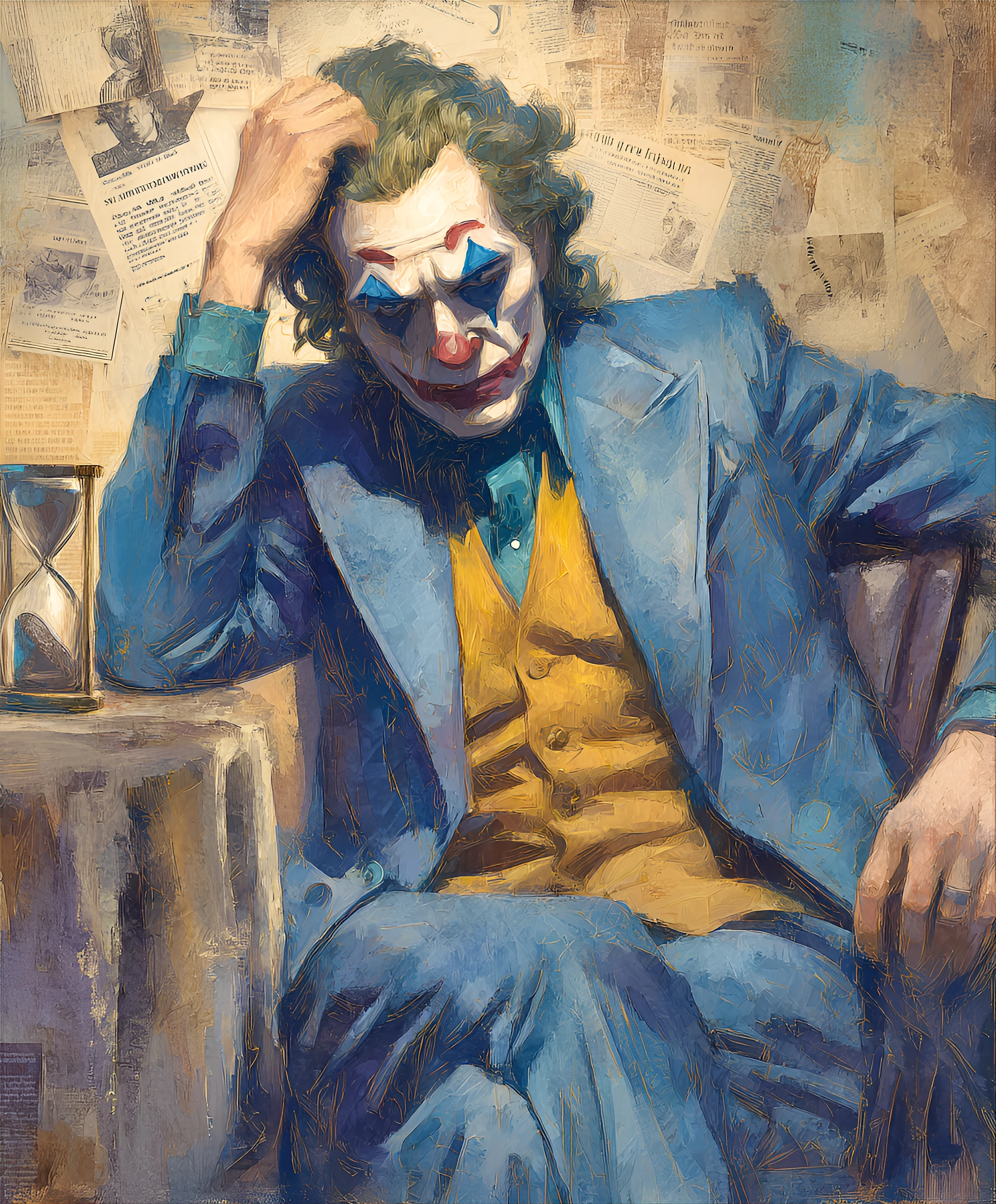 The Joker, Caucasian, mid-30s, seated, wearing a faded blue suit jacket over a mustard yellow vest, and blue trousers. His expression is melancholic, hand resting on his head. He appears pensive and perhaps regretful. The style is painterly, with visible brushstrokes and a textured surface. The colors are muted, predominantly blues, mustard yellow, and browns, creating a somber atmosphere. The lighting is diffused, casting soft shadows. A sand timer sits beside him, adding a sense of time's passage. Newspaper clippings and other collage elements are incorporated into the background. The composition is a portrait-style close-up, focusing on the Joker's seated figure. The perspective is a slightly elevated, eye-level view. The painting style is reminiscent of classic comic book art and graphic novels. The focus is on the emotional expression of the subject. High detail, painterly, graphic novel style, comic book art, somber mood, time passing, collage elements, 8k resolution
