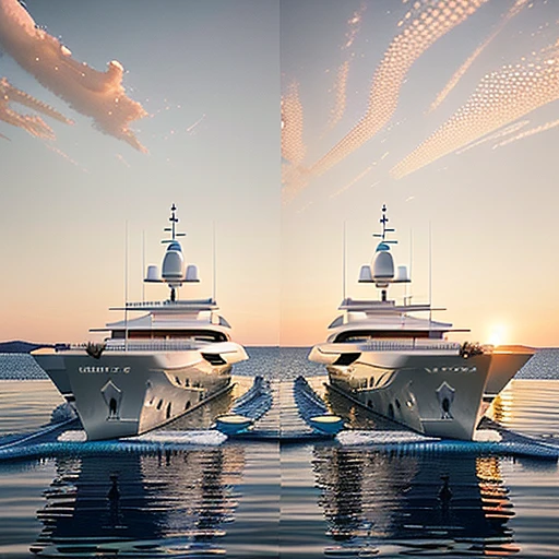 2 two white supersized yachts in St. Tropez sunrise, One yacht has painted title: WORK HARD, another yacht has painted title: WORK HARDER, highly rendered, excellent photography, intricate details, realistic, cinematic lighting, octane rendering, hyper realism