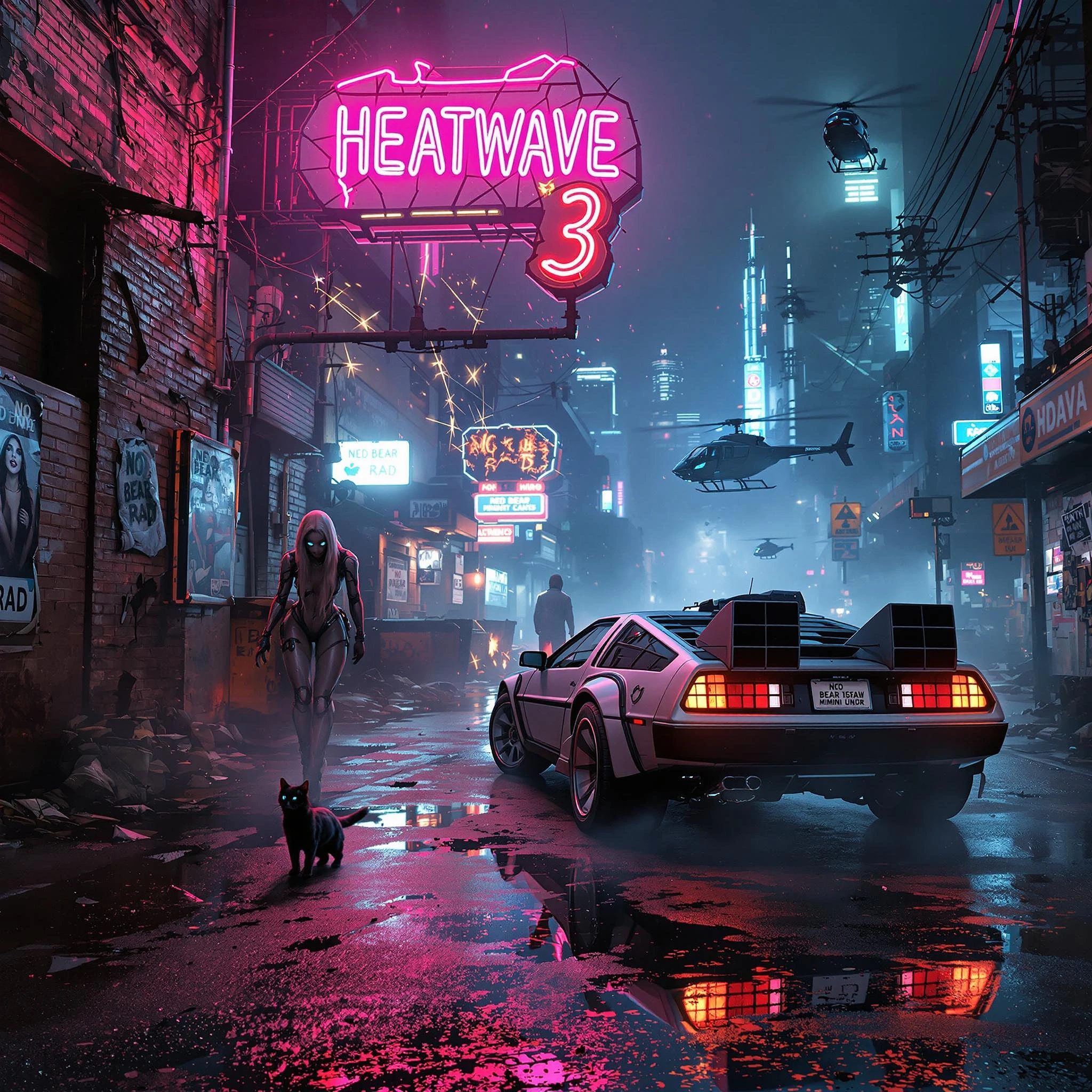 A hyperrealistic 8K cinematic masterpiece blending the gritty, neon-soaked aesthetic of a cyberpunk 1980s Tokyo alleyway with the intense action of a high-tech, futuristic battle. The scene unfolds in a dark, chaotic urban sprawl, alive with swirling fog and flickering neon lights that cast erratic, vivid glows of pink, blue, and fiery amber onto weathered brick walls and reflective puddles on the wet pavement. The alleyway is an oppressive portrait of urban decay: overflowing dumpsters with dented lids spill refuse across the ground, including torn garbage bags revealing rotting food and broken bottles. Murky, oily puddles form near rusted trash cans, reflecting the distorted neon signs above. A tattered "NO DUMPING" sign clings to a graffiti-covered wall near a massive, grimy, torn poster of a grinning model advertising a long-forgotten product. The air is thick with the smell of damp concrete, mold, and decay, immersing the viewer in this oppressive environment. Above the chaos, a cracked neon sign reading "HEATWAVE" flickers erratically, with letters inverted to resemble mirrored "3"s. The distorted lettering creates an unsettling effect as the buzzing neon tubes pulse in pink and blue. Sparks rain down from the broken sign, casting faint, glowing embers into the smoky abyss. Prominently in the foreground is a brushed silver DeLorean, its iconic lines covered with streaks of dirt and soot. The taillights glow red and amber, mirrored in the puddles below. On its license plate is the text “RED BEAR RAD, ” with "RAD" boldly emphasized in capital letters. In the middle ground, a terrified stray cat leaps from an overturned trash can, eyes wide in fear, its matted fur flying. Nearby, shadowy figures lurk—a hooded figure crouches behind a dumpster with a weapon, while another leans against the wall, half-hidden by the swirling smoke, radiating menace. In the distance, a small dog sprints away, tail tucked, disappearing into the foggy shadows. The focal point is an android combatant crouched in the heart of the alley, her sleek metallic body gleaming with precision under the flickering neon glow. Her piercing blue eyes contrast against the chaotic urban backdrop, where every detail—from the grimy textures to the luminous "HEATWAVE" sign—comes together in a vibrant, suspenseful cyberpunk universe filled with life and tension. In the foreground, a stunning female android combatant crouches within a glowing circle of light, her sleek metallic body rendered with intricate, photorealistic detail. Her long, flowing hair moves as if caught in a gentle breeze, illuminated by particles of light and fiery sparks from a massive electrical discharge behind her. Her piercing blue glowing eyes lock onto the viewer with an aura of unrelenting power and readiness, embodying the fusion of elegance and lethal precision. Beside her, an iconic DeLorean, a symbol of retro-futuristic design, stands amidst the chaos, under siege by two hovering attack helicopters armed with M134 Miniguns. Streams of tracer ammunition pierce through the thick, swirling smoke, creating arcs of fiery destruction that illuminate the urban battlefield. The DeLorean's brushed silver metallic body gleams with reflected light from the surrounding neon signs, skyscraper silhouettes, and burning wreckage. Its taillights—one a fiery red and the other an amber hue—cut sharply through the haze, their reflections rippling across the puddles below. The surrounding environment is a tapestry of destruction and decay. Burning cars smolder in the distance, shattered glass and twisted metal scatter across the ground, while torn flyers cling to graffiti-covered walls. Overflowing dumpsters and rusted trash cans add to the dystopian atmosphere, complemented by the distant hum of sirens, the roar of helicopter engines, and the intermittent crackle of neon signs. A cracked neon sign reading "HEATWAVE" flickers erratically, illuminating the scene in pulses of vibrant energy. Volumetric lighting streams through the dense smoke, casting soft, diffused beams across the android’s gleaming body and the DeLorean’s muscular contours. Subtle reflections of nearby city lights ripple across the car’s angular lines, emphasizing its aggressive stance. The background cityscape looms, softened by the haze, with towering high-rises and distant neon signs peeking through the fog. The atmosphere is electric, alive with tension and visual intensity, as if pulled straight from an epic 1980s action-drama infused with high-tech cyberpunk fantasy. Every detail—from the fine grit on the street to the intricate mechanics of the android and the DeLorean’s polished wheels—contributes to the breathtaking realism of the scene. The dynamic composition, vibrant neon hues, and dramatic interplay of light and shadow create an unforgettable, immersive cinematic experience, perfect for showcasing on ArtStation or as a defining piece in the world of digital art.