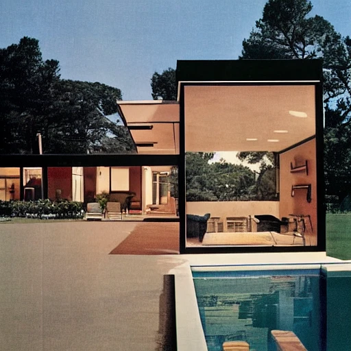 hyper realistic eye level exterior photo of a mid century modern style house overlooking the ocean, daylight, indirect lighting, AD magazine, Frank Lloyd, Eames, Mies van der Rohe