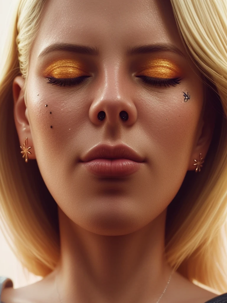 close-up portrait blonde Brazilian, very small facial tattoo, closed eyes, luxury, bright colors, dark illumination, very detailed artwork, trending on artstation, symmetrical, cinematic, hyper realism, high definition, octane render, 8k