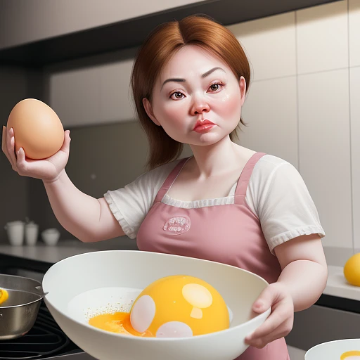 Realistic-caricature of a big-headed baby with the face of an Chinese adult woman emerging from a newly hatched egg, holding the rim of the egg, the yolk. The background is several broken eggs of the same size, in the kitchen, a woman is cooking. Ultra HD, 5k.