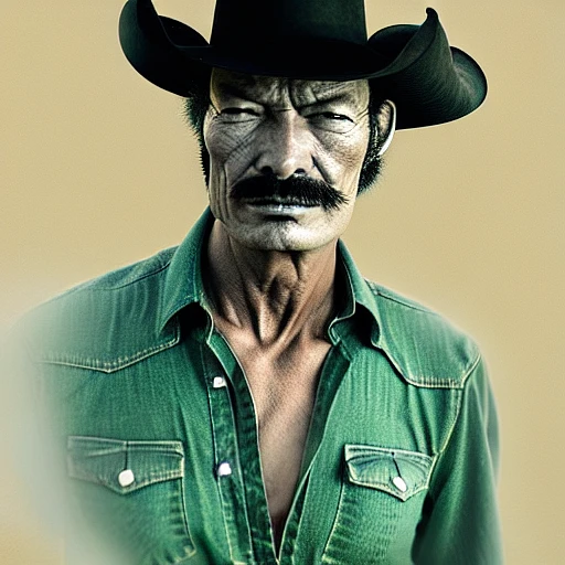 retrato de vaquero, cara de lee van cleef joven de 40 años, piel verde oliva, pelo largo y rubio, sombrero stetson negro, fondo liso, elegante, muy detallado, chaqueta negra, pintura digital, arte conceptual, suave, enfoque nítido, ilustración, bigote
