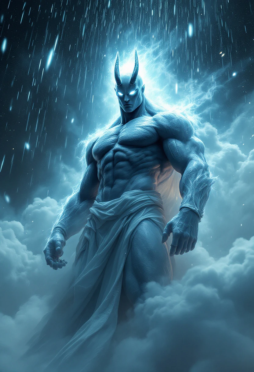 God of Rain, full-body, Etherial, muscular, No hair, Glowing White eyes, epic, cinematic, 8k, hyper detailed, ultra detailed, Controlling Clouds raining in space, standing powerfully in a outer space with the fabric of space and time being pulled, small pair of White horns on the top of his head, photorealistic, unreal engine, octane render, sharp image