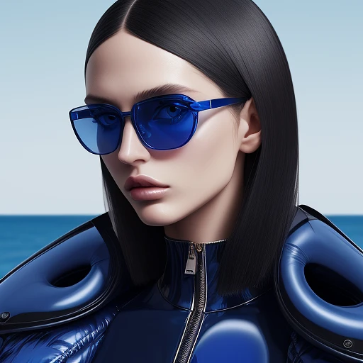 Fashion shoot, Jacquemus and Moncler collaboration: dark blue translucent futuristic sunglasses, hyper-realistic, detailed 8k, realistic --ar 2:3 --s 750