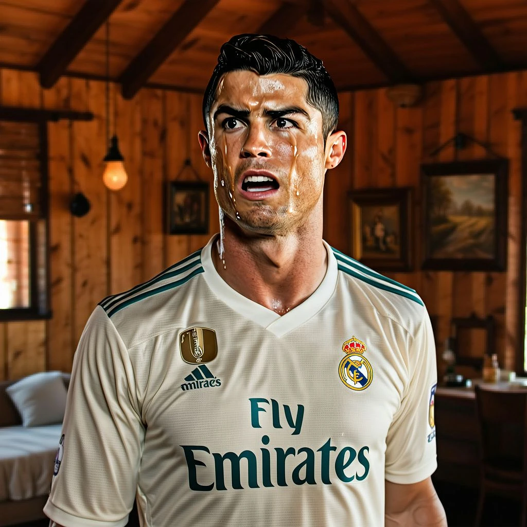 A highly detailed and emotional close-up of Cristiano Ronaldo wearing a Real Madrid jersey, standing inside a rustic wooden cabin with warm lighting. His expression is deeply emotional, with tears streaming down his face, conveying sadness and intensity. His strong facial features, furrowed brows, and slightly pursed lips add to the raw emotion of the moment. The background consists of wooden beams, vintage furniture, and soft lighting, creating a melancholic yet powerful atmosphere. The focus should be on Ronaldo’s face, highlighting every detail of his emotion while maintaining a cinematic and dramatic tone