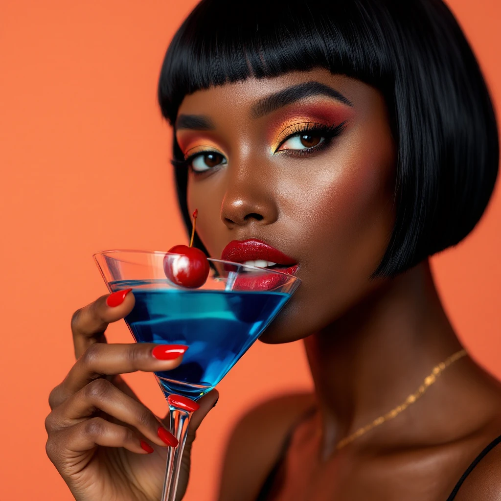 CLOSE UP PORTRAIT , WOMAN AGE 30, VENUZUALIAN STUNNING BEAUTY, SHARP BOBCUT BLACK HAIR, RED LIPSTICK, MASCARA BLACK EYE LINER, DARK EYE SHADOW, BROWN EYES, BRONZE TANNED SKIN, RED NAIL VARNISH DRINKING A DEEP BLUE LIQUID FROM A COCKTAIL GLASS, A SPLIT CHERRY IS ON THE RIM OF THE GLASS, BACKGROUND IS A PEACH COLOUR ADOBE WALL. FACE IS SLIGHTLY TURNED AWAY FROM VIEWER. SHARP FOCUS. 50MM LENS FULL FRAME CAMERA .