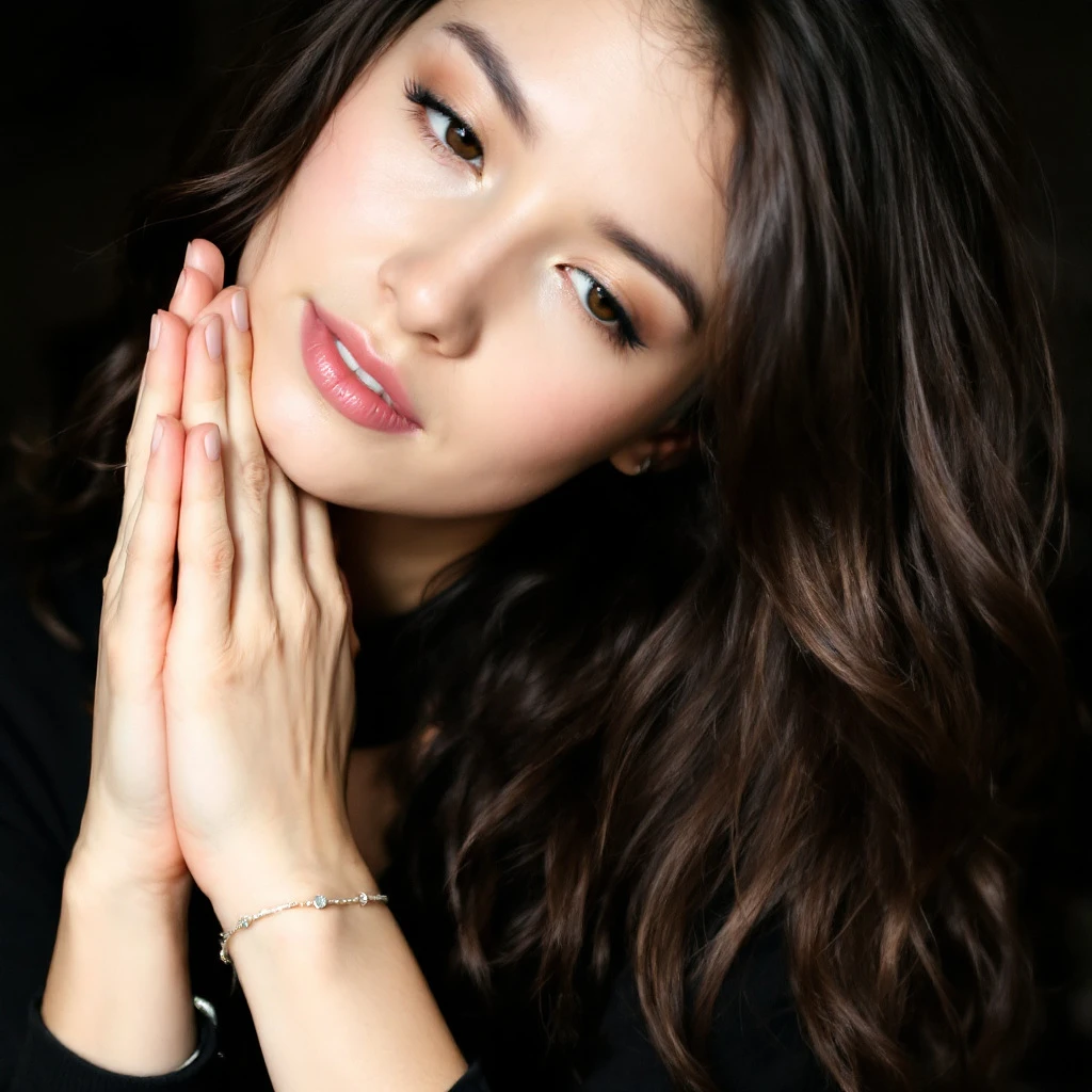 A young woman with long wavy brunette hair rests her head on her clasped hands. She wears a black top and a delicate bracelet on her left wrist. Her expression is soft and contemplative, with natural makeup and subtle pink lipstick. The background is dark and blurred, focusing on her face and hands.