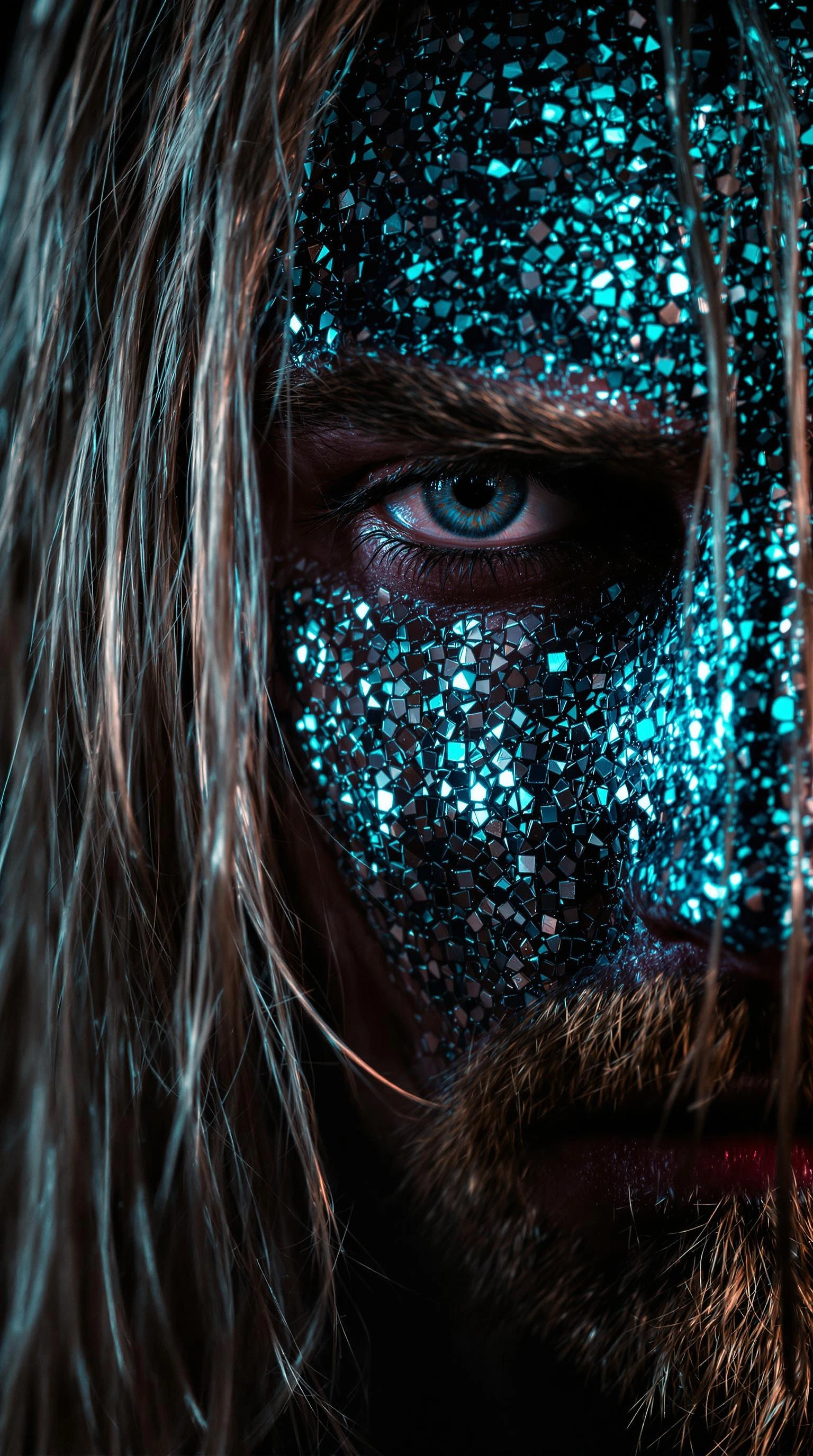 The image is a close-up portrait of a person with long hair and a beard. The focus is on the face, particularly the striking blue eyes and textured skin, which appears to have a reflective, mosaic-like pattern. The lighting is dramatic, highlighting the contours of the face and emphasizing the unique texture. The overall look is artistic and stylized, creating a visually intriguing effect.